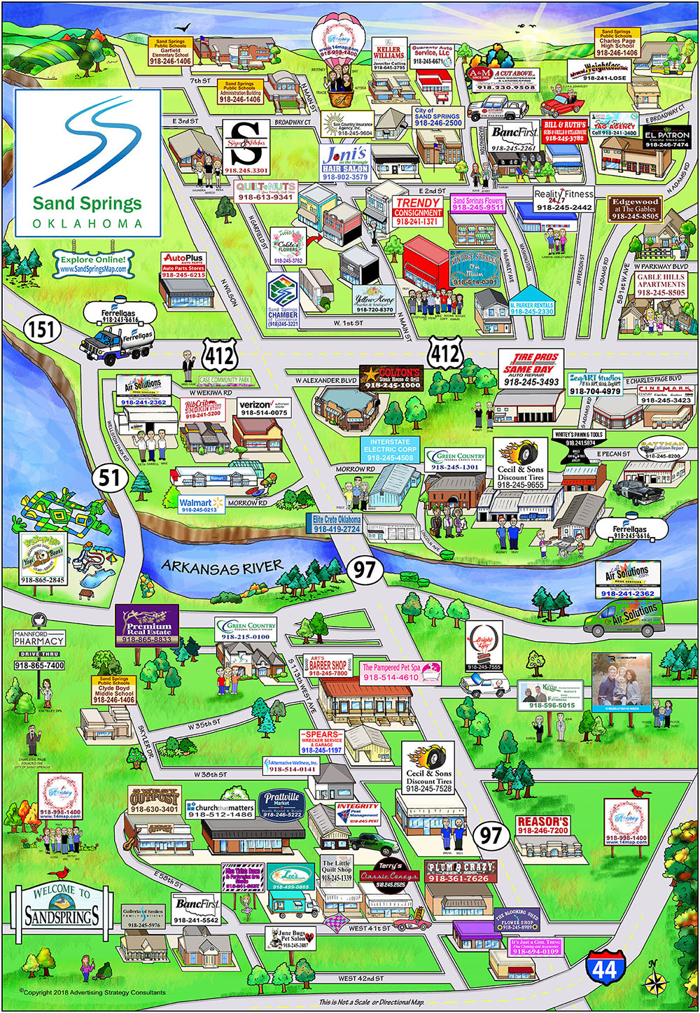 Check out the tabs across the top of the Map to go to the categorized "Business Directory" to find out more about Sand Springs businesses and organizations or find out more about our Business – Advertising Strategy Consultants by clicking on the "About Us" tab.